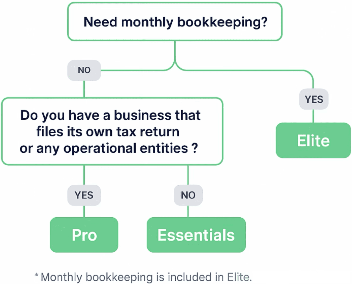 Both Pro & Elite include two semi-annual Strategy Sessions that blend tax + books; tax projections are delivered with those sessions. Essentials get an annual Strategy Session.